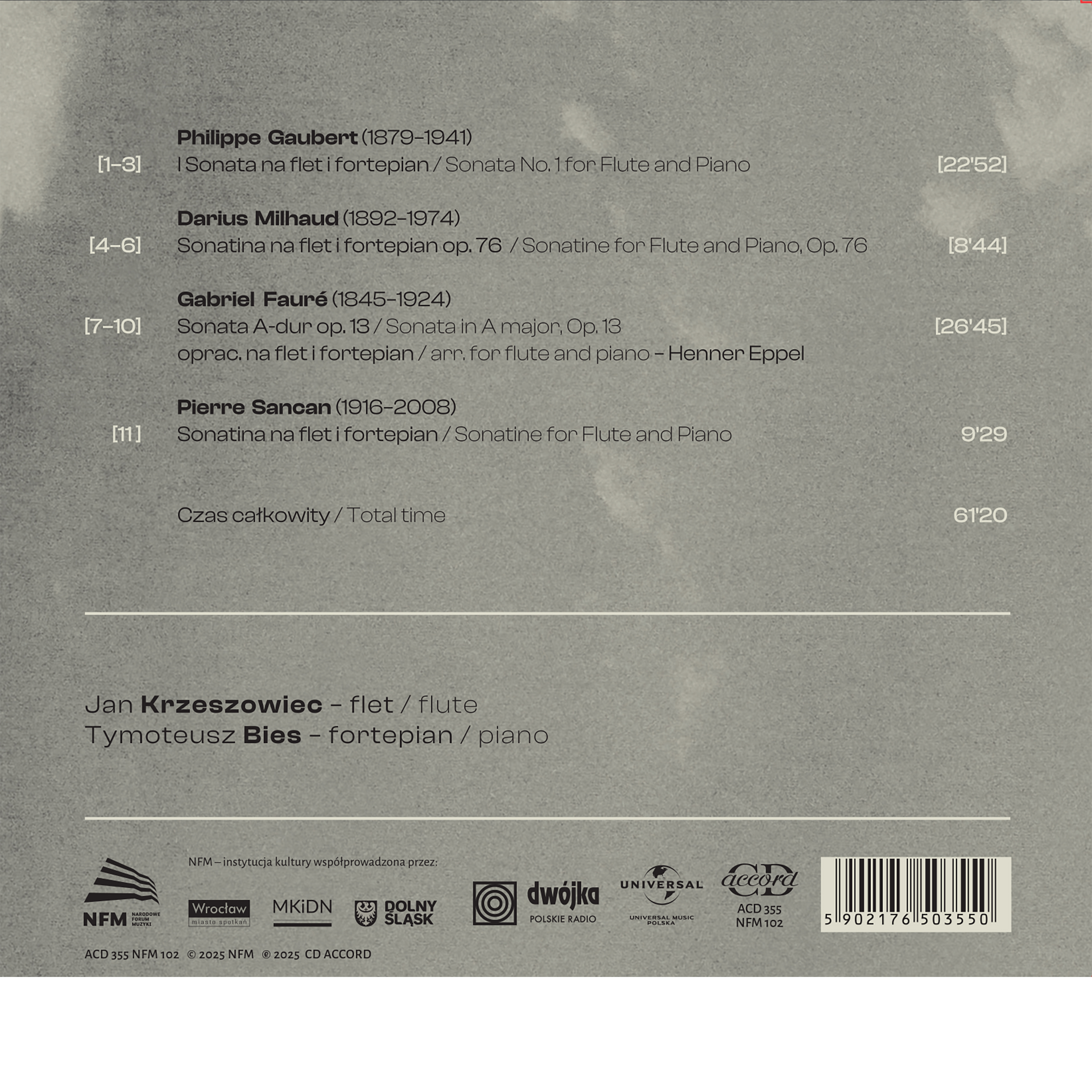 Debiutancka solowa płyta flecisty Jana Krzeszowca, nagrana z towarzyszeniem pianisty Tymoteusza Biesa, zawiera utwory Gabriela Faurégo, Philippe’a Gauberta, Dariusa Milhauda oraz Pierre’a Sancana. Album zarejestrowano w doskonałej akustycznie Sali Głównej ORLEN Narodowego Forum Muzyki.