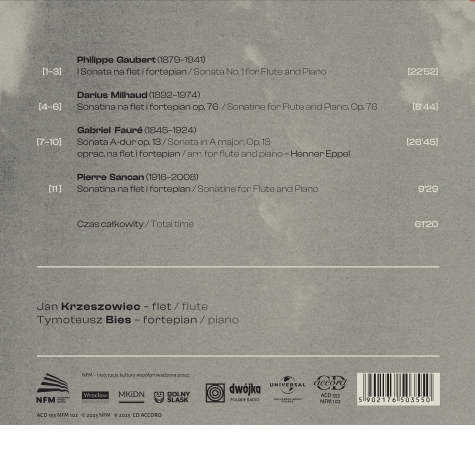 Francuska muzyka fletowa zajmuje wyjątkowe miejsce w repertuarze flecistów, miała bowiem znaczący wpływ na współczesną sztukę gry na tym instrumencie. Zdecydował o tym złożony fenomen francuskiej szkoły fletowej, która rozkwitła na przełomie wieków XIX i XX. Jednym z obszarów jej oddziaływania było powstawanie bogatego repertuaru, uwzględniającego nowy styl wykonawstwa. Jan Krzeszowiec wybrał na swój solowy debiut fonograficzny utwory Gabriela Faurégo, Philippe’a Gauberta, Dariusa Milhauda oraz Pierre’a Sancana, by zmierzyć się z fletową klasyką i ukazać własną jej interpretację. Przy fortepianie towarzyszy fleciście Tymoteusz Bies. Szymon Atys, fragment eseju zamieszczonego w booklecie dołączonym do płyty