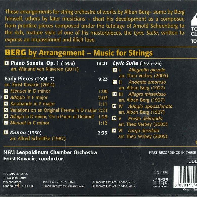 Wydana przez londyńską firmę Toccata Classics kolejna płyta NFM Orkiestry Leopoldinum pod batutą dyrektora artystycznego zespołu, Ernsta Kovacica. Na albumie znalazły się premierowe nagrania aranżacji na orkiestrę dzieł Albana Berga.