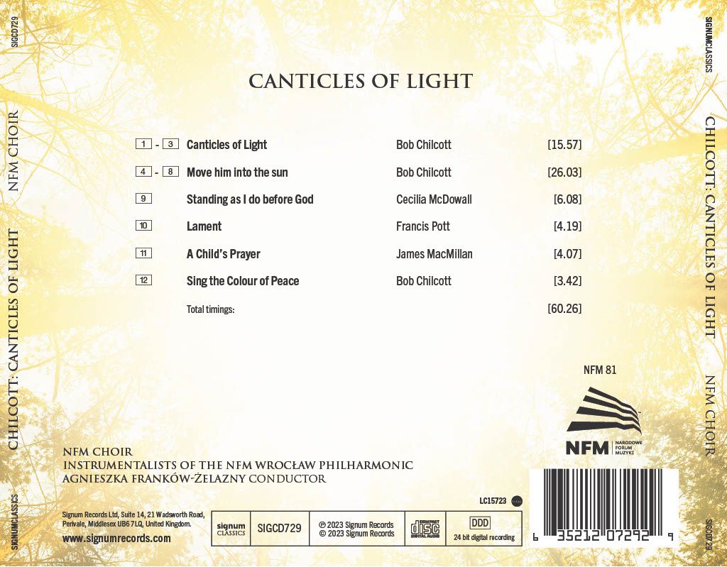 Canticles of Light to dziewiąty album z kompozycjami Boba Chilcotta wydany przez Signum Records. Oprócz utworów napisanych przez tego artystę płyta zawiera dzieła innych kompozytorów, takich jak Cecilia McDowall, Francis Pott i James MacMillan. Całość została starannie wybrana przez Chilcotta i Agnieszkę Franków-Żelazny, przy czym ostatni z utworów na płycie został specjalnie napisany dla Chóru NFM.