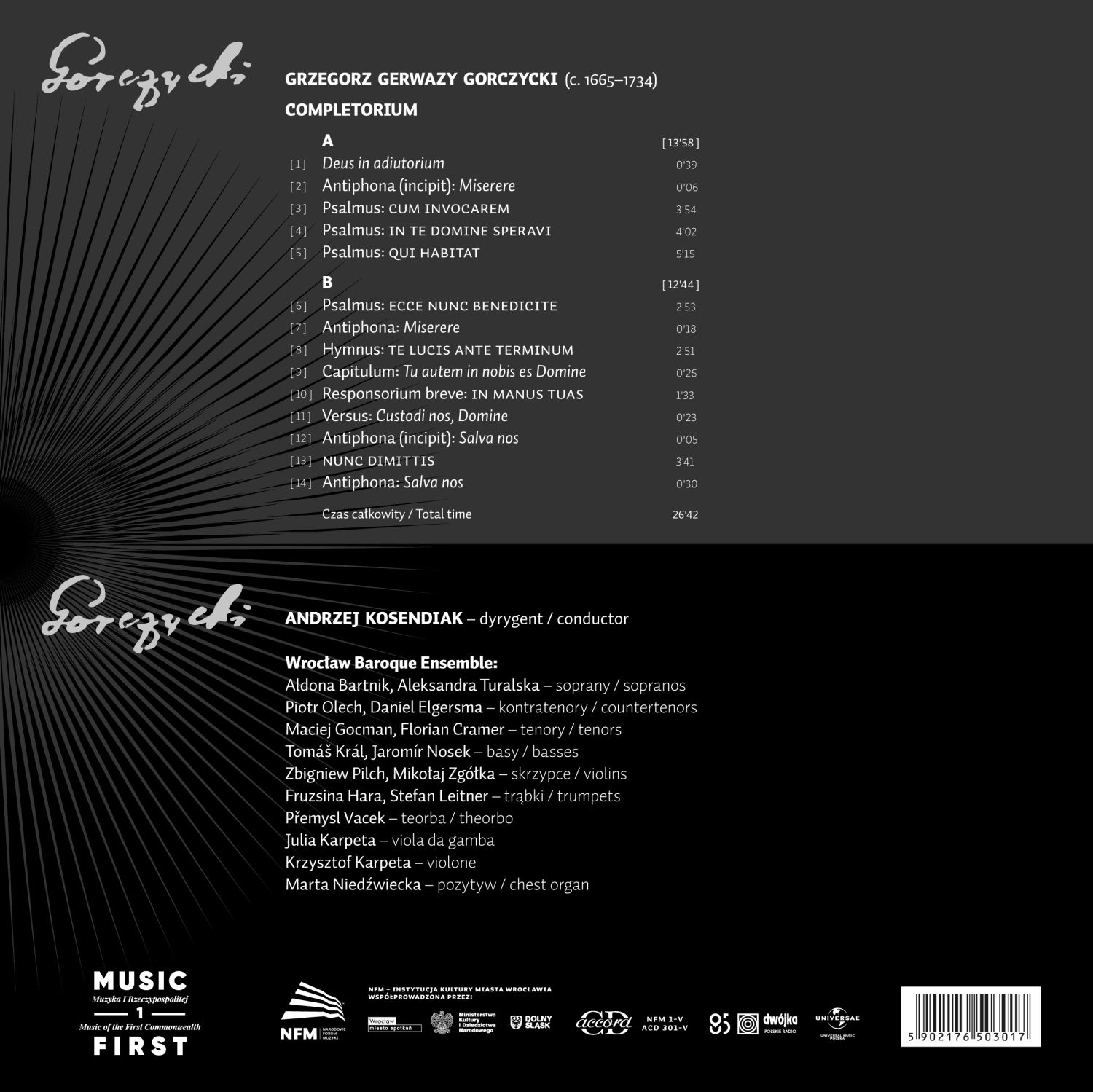 Pierwszy winylowy album Narodowego Forum Muzyki. Na płycie, nagranej przez Wrocław Baroque Ensemble pod dyrekcją Andrzeja Kosendiaka, znalazło się Completorium Grzegorza Gerwazego Gorczyckiego, czyli muzyczne opracowanie wybranych części komplety – ostatniego nabożeństwa liturgii godzin. Dzieło zostało uzupełnione właściwymi dla celebracji liturgii godzin antyfonami i fragmentami z monodii gregoriańskiej. Wydawnictwo dopełnia muzykologiczny komentarz przygotowany przez dr. Macieja Jochymczyka we współpracy z dr. hab. Jakubem Kubieńcem, prof. UJ. Album winylowy Grzegorz Gerwazy Gorczycki – Completorium to kolejne wydawnictwo ukazujące się w ramach przygotowywanego przez Narodowe Forum Muzyki i CD Accord od 2012 roku cyklu Music First. Muzyka I Rzeczypospolitej, który prezentuje twórczość mistrzów polskiego renesansu i baroku pod dyrekcją Andrzeja Kosendiaka.