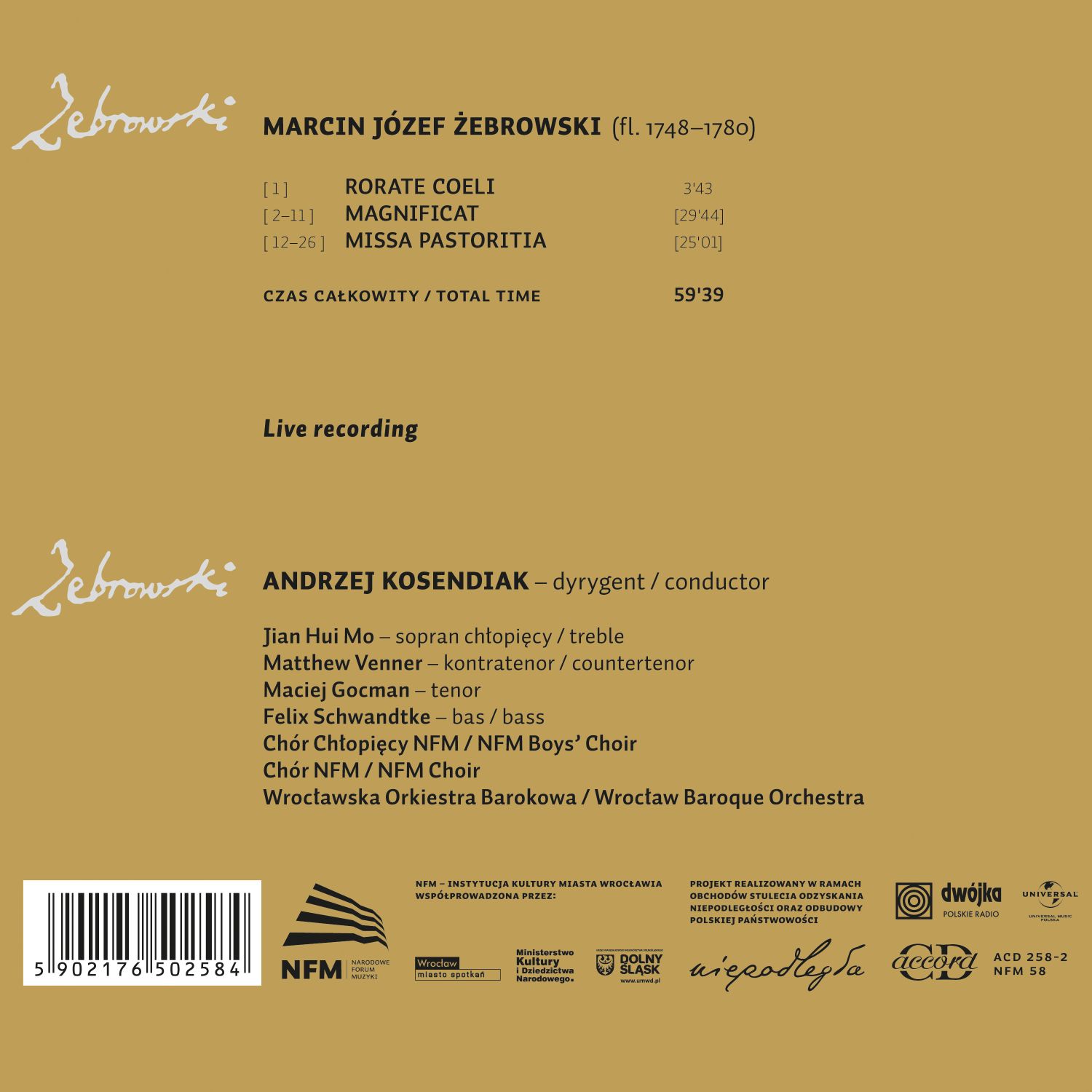 Wykonawcy: Jian Hui Mo, Matthew Venner, Maciej Gocman, Felix Schwandtke, Chór Chłopięcy NFM, Małgorzata Podzielny, Chór NFM, Wrocławska Orkiestra Barokowa