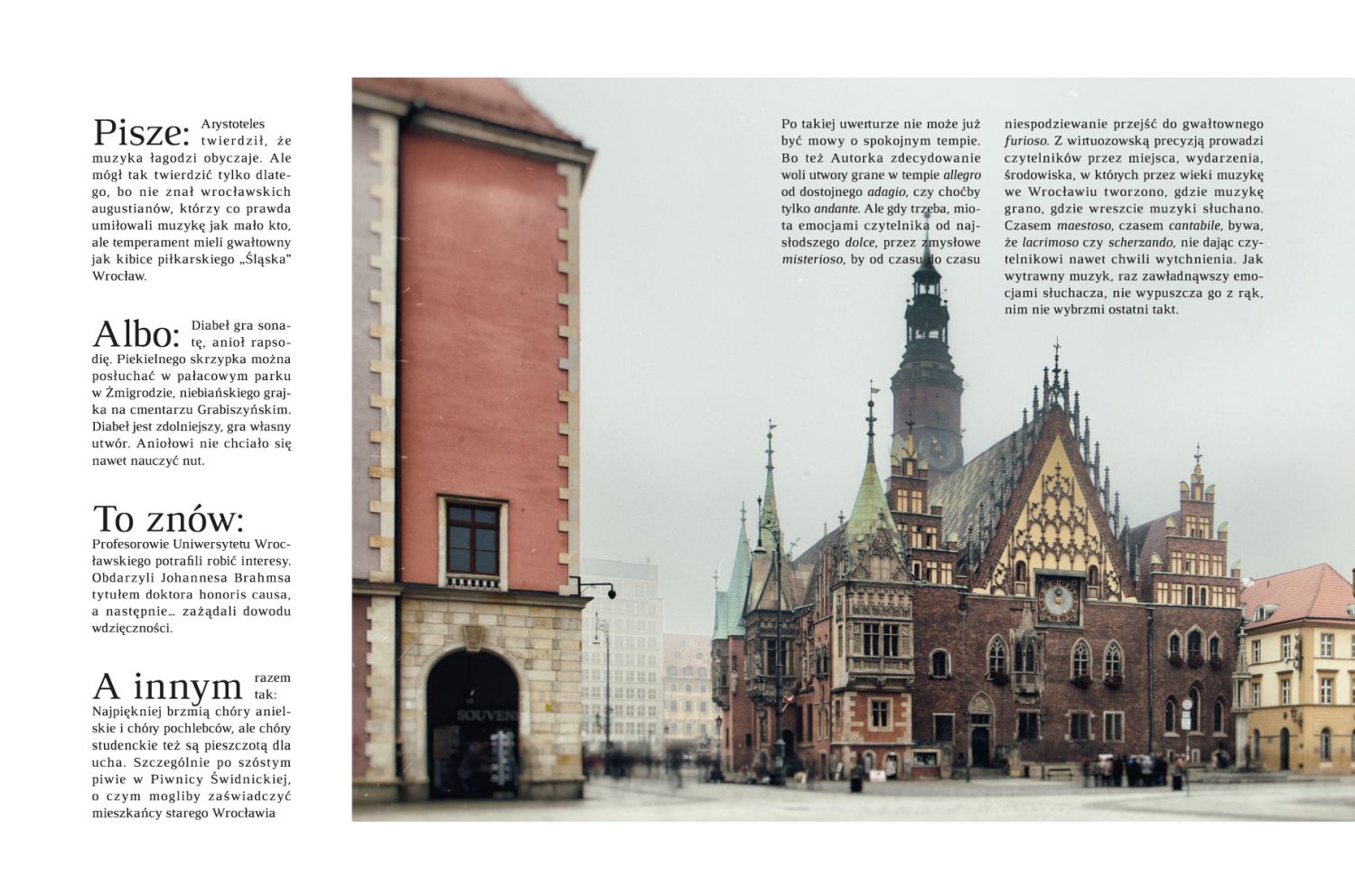Po takiej uwerturze nie może już być mowy o spokojnym tempie. Bo też autorka zdecydowanie woli utwory grane w tempie allegro od dostojnego adagio, czy choćby tylko andante. Ale gdy trzeba, miota emocjami czytelnika od najsłodszego dolce, przez zmysłowe misterioso, by od czasu do czasu niespodziewanie przejść do gwałtownego furioso. Z wirtuozowską precyzją prowadzi czytelników przez miejsca, wydarzenia, środowiska, w których przez wieki muzykę we Wrocławiu tworzono, gdzie muzykę grano, gdzie wreszcie muzyki słuchano. Czasem maestoso, czasem cantabile, bywa, że lacrimoso czy scherzando, nie dając czytelnikowi nawet chwili wytchnienia. Jak wytrawny muzyk, raz zawładnąwszy emocjami słuchacza nie wypuszcza go z rąk, nim nie wybrzmi ostatni takt.