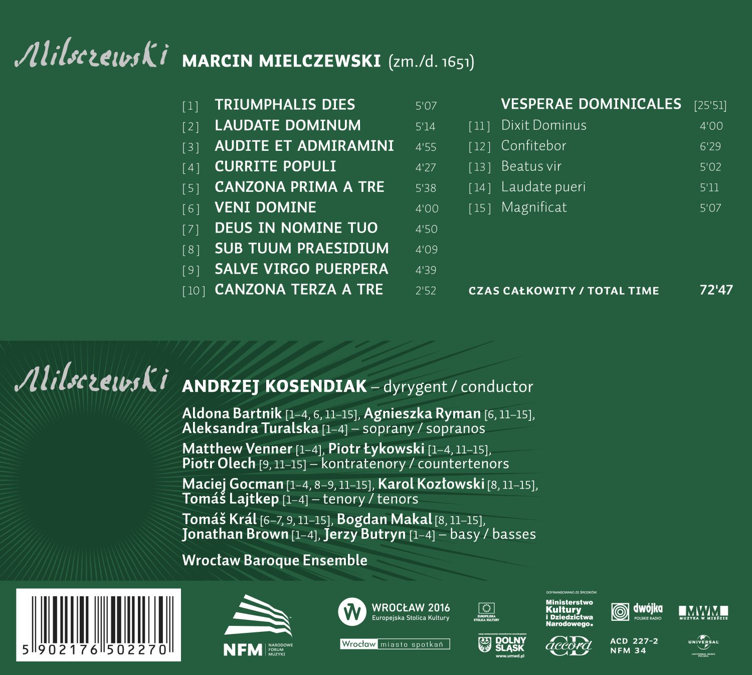 Pierwsza płyta Andrzeja Kosendiaka i Wrocław Baroque Ensemble z muzyką Marcina Mielczewskiego, najpopularniejszego polskiego kompozytora XVII w. Album zawiera m.in. nieszpory tego kompozytora w zrekonstruowanej formie, w jakiej mogły być grane w przeszłości – obsada instrumentalna została wzbogacona o kornety i puzony. Niektóre z utworów pochodzą z kolekcji kościoła św. Marii Magdaleny we Wrocławiu.